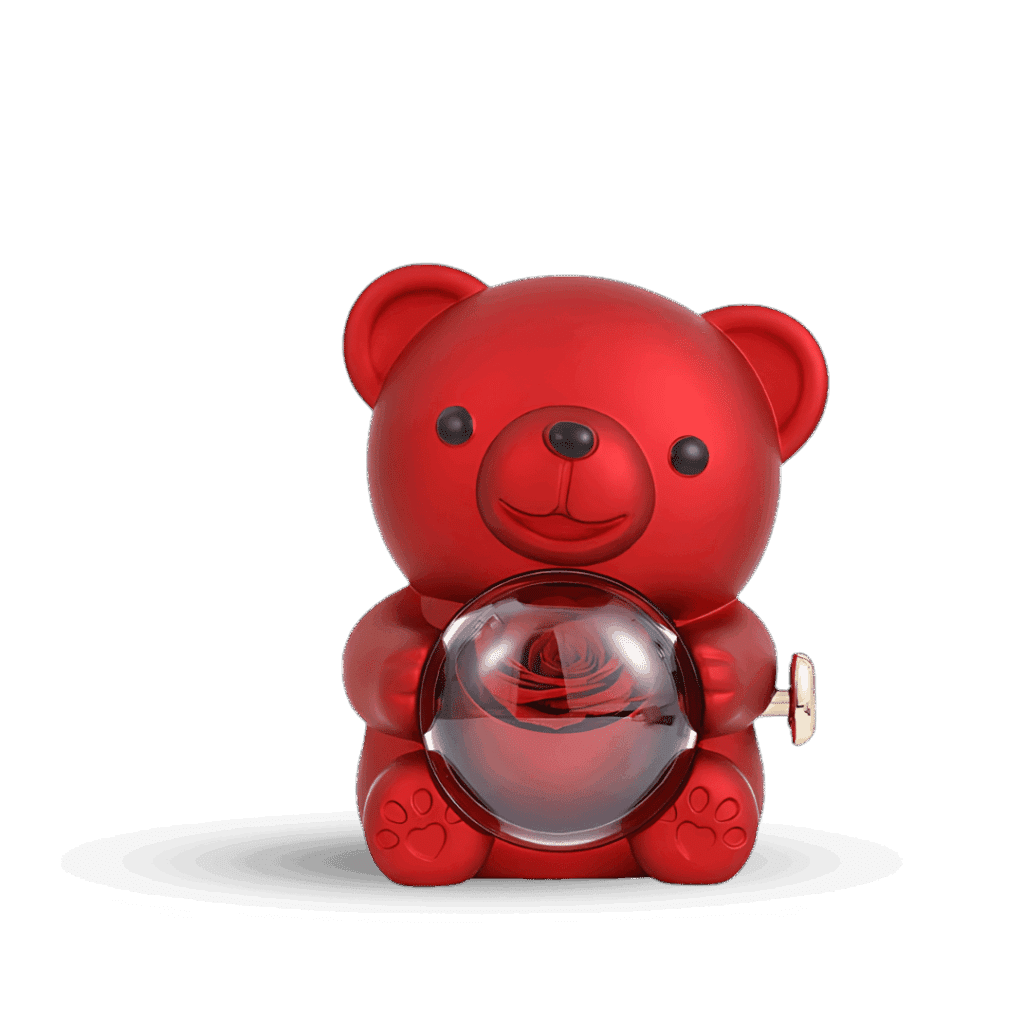 דובי אדום מעוצב עם ורד אמיתי שעבר שימור מיוחד ושרשרת עם חריטה אישית לבחירתכם